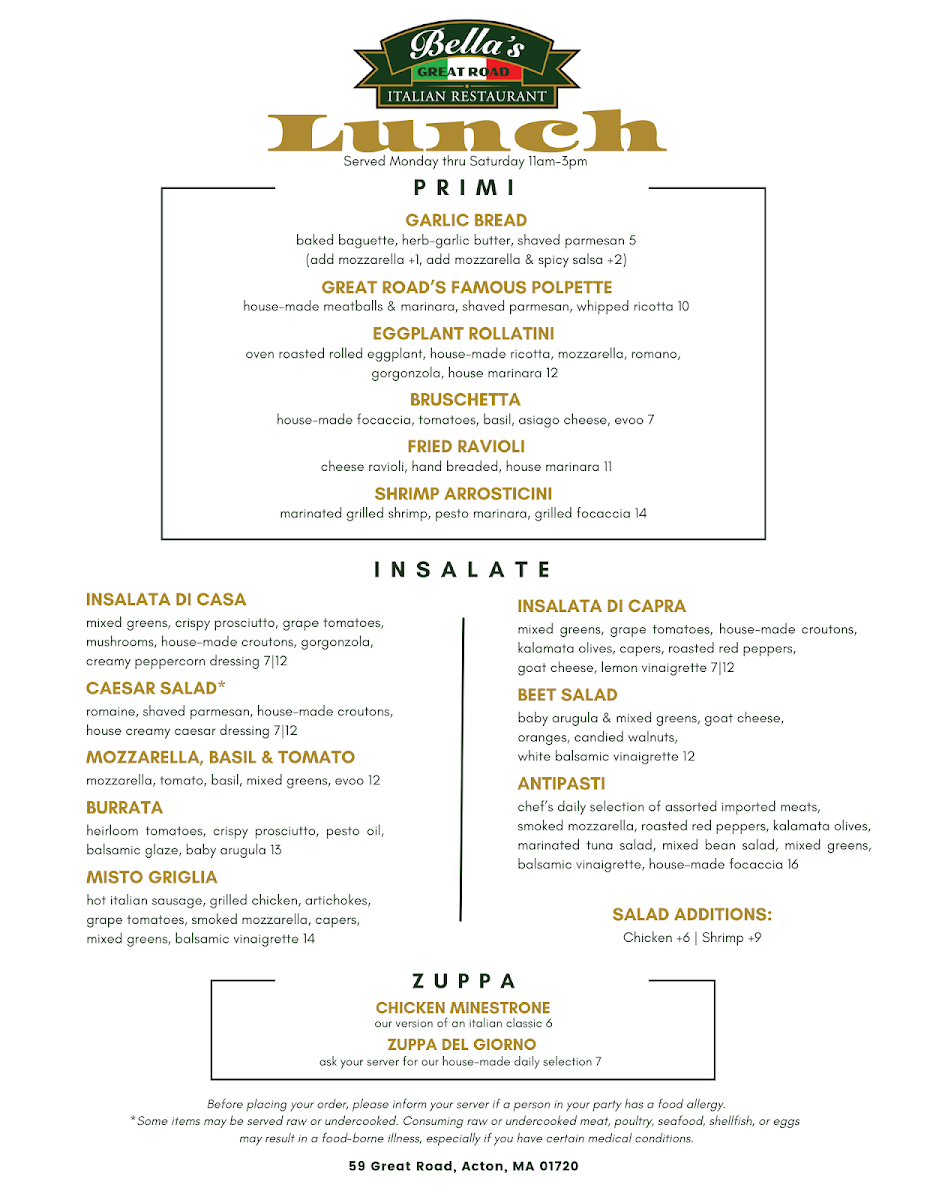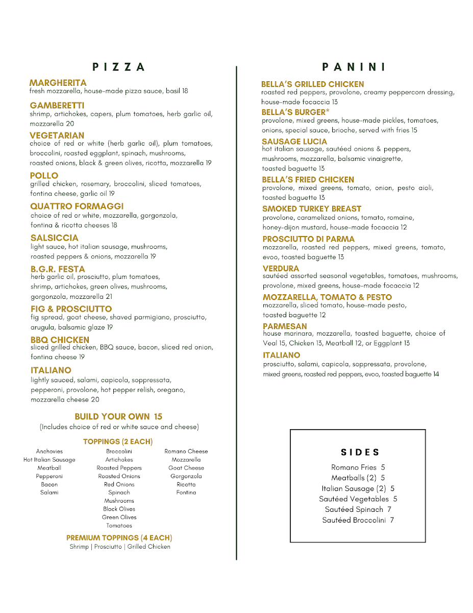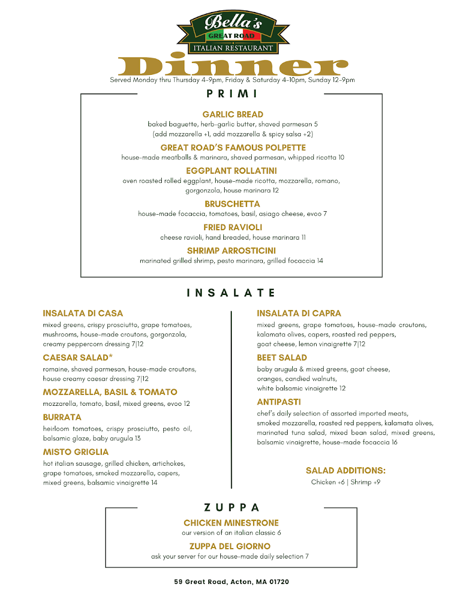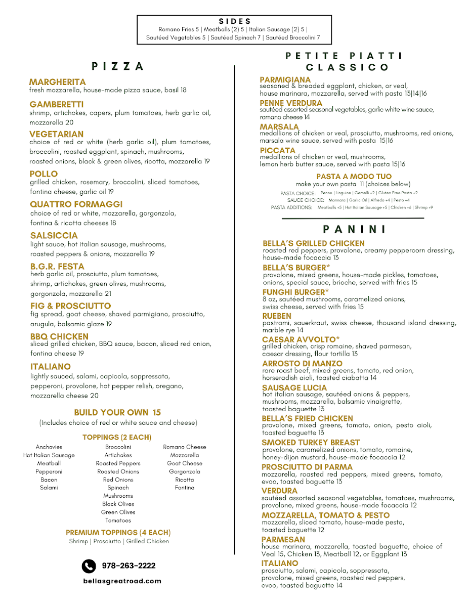 From a reviewer's perspective, the menu at Bella's Great Road at 59 Great Rd, Acton, MA, offers a well-rounded and inviting selection that caters to a wide range of tastes. Pizza lovers can enjoy classics like Margherita and Quattro Formaggi, or more adventurous options such as Gamberetti and VegetarianPollo. The Panini section features hearty sandwiches including Bella's Grilled Chicken, Bella's Burger, Sausage LuciaBella's Fried Chicken, and Smoked Turkey Breast, all paired perfectly with sides like Romano Fries, Meatballs, Italian Sausage, or lighter choices such as Sautéed Vegetables and Sautéed Spinach. For those seeking Italian favorites, the Petite Piatti Classico offers Parmigiana, Penne Verdura, and delicate dishes like MarsalaPiccata. Appetizers under Primi are equally tempting with Garlic Bread, Great Road's Famous Polpette, Eggplant RollatiniBruschetta, and Fried Ravioli. Fresh salads like Insalata Di Casa, Caesar Salad, Mozzarella, Basil & TomatoBurrata, and Misto Griglia provide a refreshing balance, while soups such as Chicken Minestrone and Zuppa Del Giorno bring comfort to any table. The Piatti Classico section revisits Italian staples with Marsala, Piccata, CarciofiPollo Verona, and Parmigiana, while Pasta Ripiene features stuffed pasta favorites like Ravioli Di Araosta, Ravioli Di Funghi, Ravioli Di FormaggioTortellini Con Broccolini, and Tortellini Pomodoro. Traditional pasta dishes such as Penne Con Broccolini, Penne Con Spinaci, Linguine Ala Nonna, Linguine Di Cucina, and Linguine Vongole round out the menu with satisfying flavors. To finish on a sweet or festive note, the dessert and cocktail offerings include Coconutmartini, Pumpkin Butter Cup, Pumpkin Spiced Martini, Fig Old Fashioned, and Fall Dark & Stormy, making Bella's menu not only comprehensive but also seasonally inspired. Overall, the menu reflects both classic Italian comfort and creative seasonal touches, delivering something for everyone.