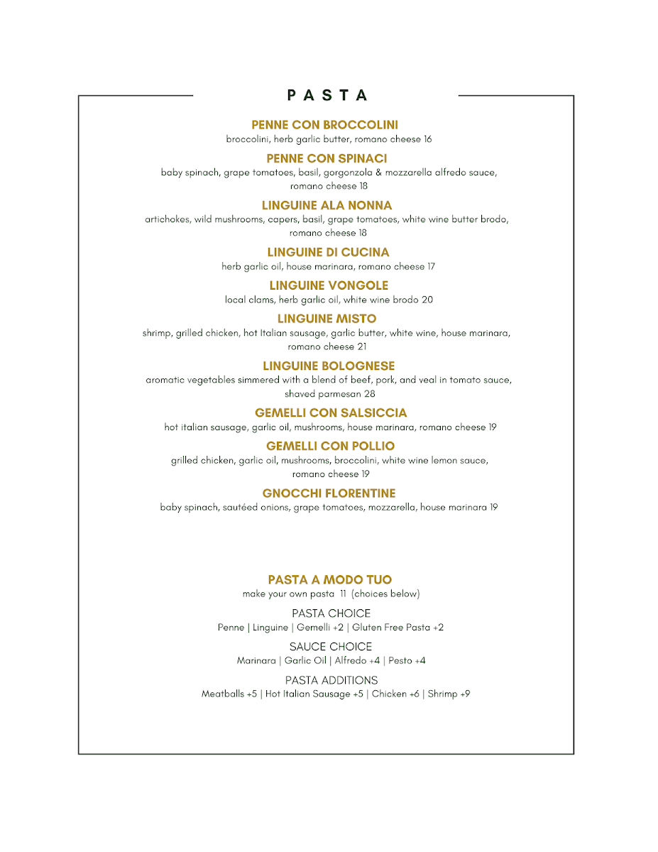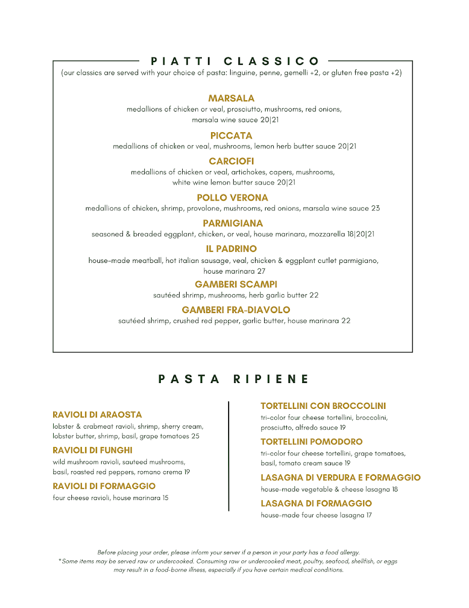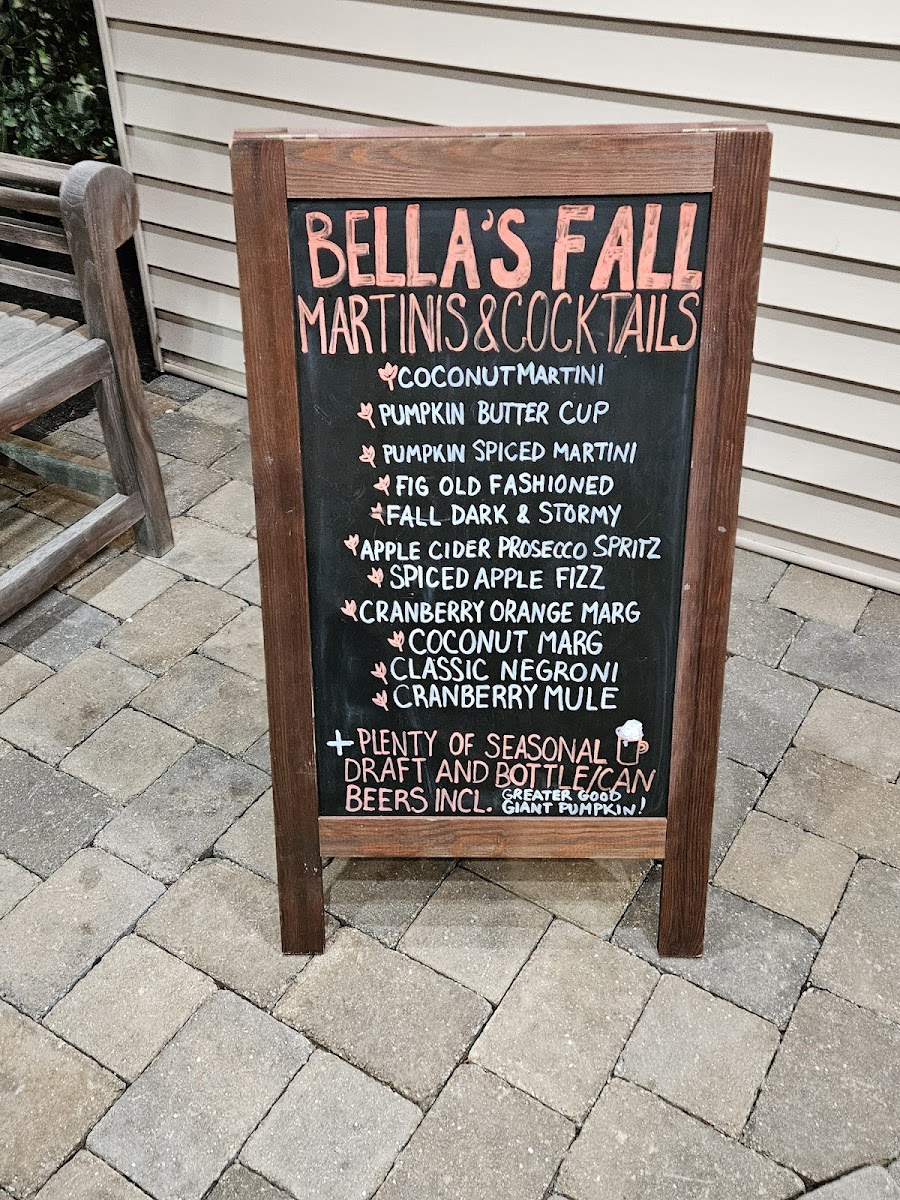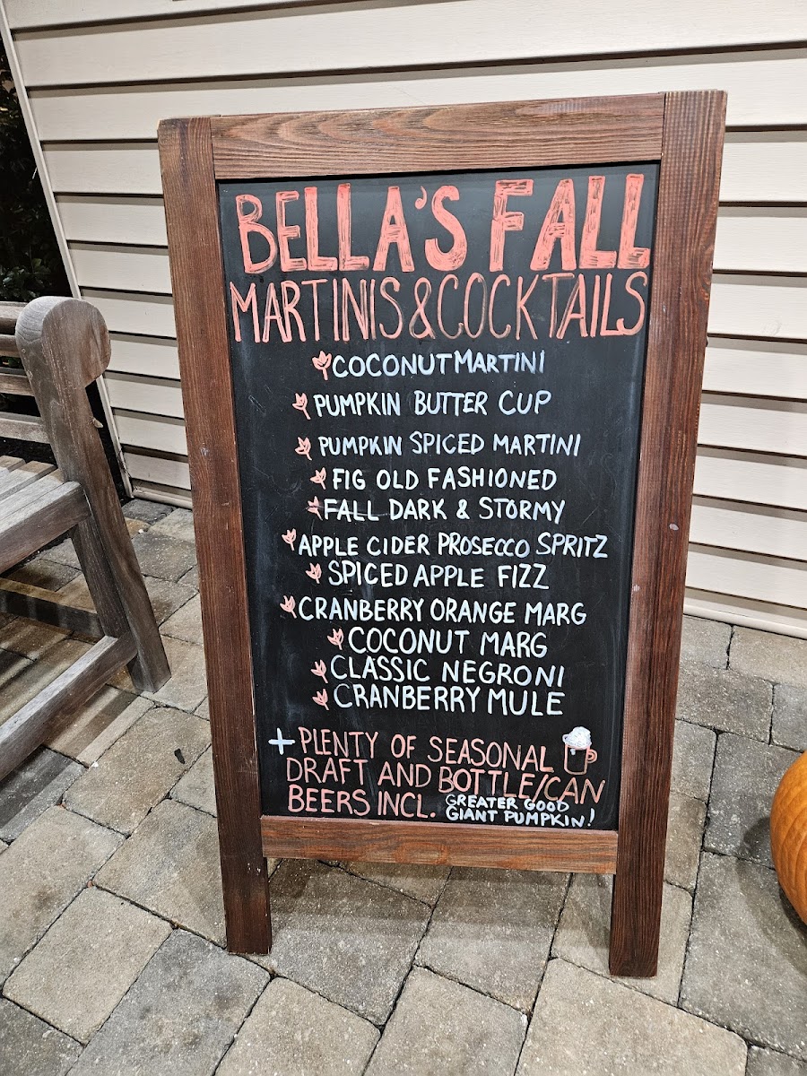 From a reviewer's perspective, the menu at Bella's Great Road at 59 Great Rd, Acton, MA, offers a well-rounded and inviting selection that caters to a wide range of tastes. Pizza lovers can enjoy classics like Margherita and Quattro Formaggi, or more adventurous options such as Gamberetti and VegetarianPollo. The Panini section features hearty sandwiches including Bella's Grilled Chicken, Bella's Burger, Sausage LuciaBella's Fried Chicken, and Smoked Turkey Breast, all paired perfectly with sides like Romano Fries, Meatballs, Italian Sausage, or lighter choices such as Sautéed Vegetables and Sautéed Spinach. For those seeking Italian favorites, the Petite Piatti Classico offers Parmigiana, Penne Verdura, and delicate dishes like MarsalaPiccata. Appetizers under Primi are equally tempting with Garlic Bread, Great Road's Famous Polpette, Eggplant RollatiniBruschetta, and Fried Ravioli. Fresh salads like Insalata Di Casa, Caesar Salad, Mozzarella, Basil & TomatoBurrata, and Misto Griglia provide a refreshing balance, while soups such as Chicken Minestrone and Zuppa Del Giorno bring comfort to any table. The Piatti Classico section revisits Italian staples with Marsala, Piccata, CarciofiPollo Verona, and Parmigiana, while Pasta Ripiene features stuffed pasta favorites like Ravioli Di Araosta, Ravioli Di Funghi, Ravioli Di FormaggioTortellini Con Broccolini, and Tortellini Pomodoro. Traditional pasta dishes such as Penne Con Broccolini, Penne Con Spinaci, Linguine Ala Nonna, Linguine Di Cucina, and Linguine Vongole round out the menu with satisfying flavors. To finish on a sweet or festive note, the dessert and cocktail offerings include Coconutmartini, Pumpkin Butter Cup, Pumpkin Spiced Martini, Fig Old Fashioned, and Fall Dark & Stormy, making Bella's menu not only comprehensive but also seasonally inspired. Overall, the menu reflects both classic Italian comfort and creative seasonal touches, delivering something for everyone.